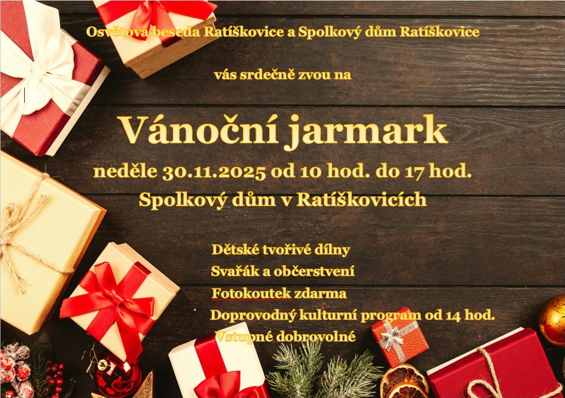 Vánoční jarmark se uskuteční 30. 11. od 10:00 do 17:00 hodin ve Spolkovém domě v Ratíškovicích. Na jarmarku si můžete užít tvořivé dílny, ochutnat svařené víno a další občerstvení. Od 14:00 hod. proběhne doprovodný kulturní program.