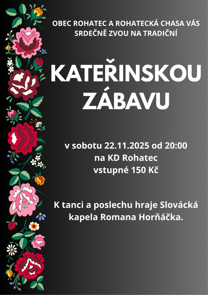 Zveme vás na tradiční Kateřinskou zábavu, která se uskuteční 22. 11. od 20:00 hodin v Kulturním domě Rohatec. K tanci a poslechu zahraje Slovácká kapela Romana Horňáčka. Přijďte si užít večer plný tance a zábavy s přáteli. Vstupné je 150 Kč.