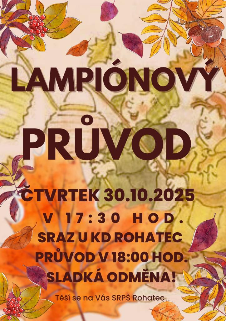Zveme vás na lampiónový průvod, který se uskuteční 30. října. Sraz je naplánován u Kulturního domu Rohatec v 17:30 hodin, přičemž samotný průvod vyjde v 18:00 hodin. Těšit se můžete na sladkou odměnu na konci akce.