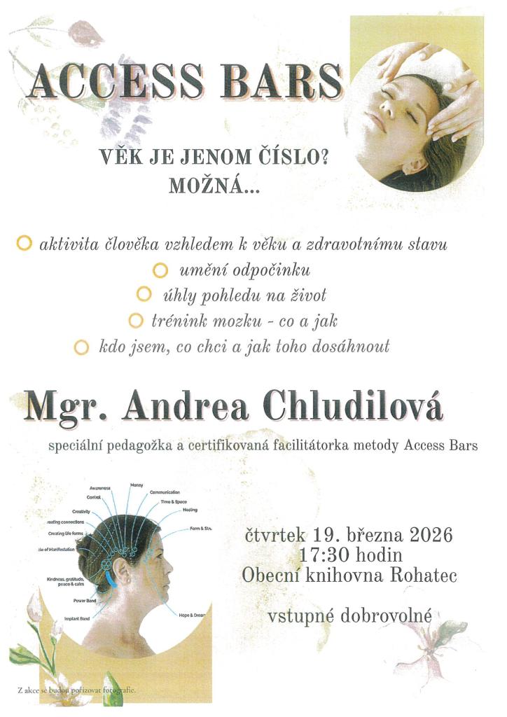 Přednáška Access Bars se zaměřuje na techniku uvolňování stresu. Mgr. Andrea Chludilová představí tuto metodu, která je založena na jemném doteku určitých bodů na hlavě, které pomáhají uvolnit napětí a stres. Akce se koná v Obecní knihovně Rohatec dne 19. 3. od 17:30 hod.