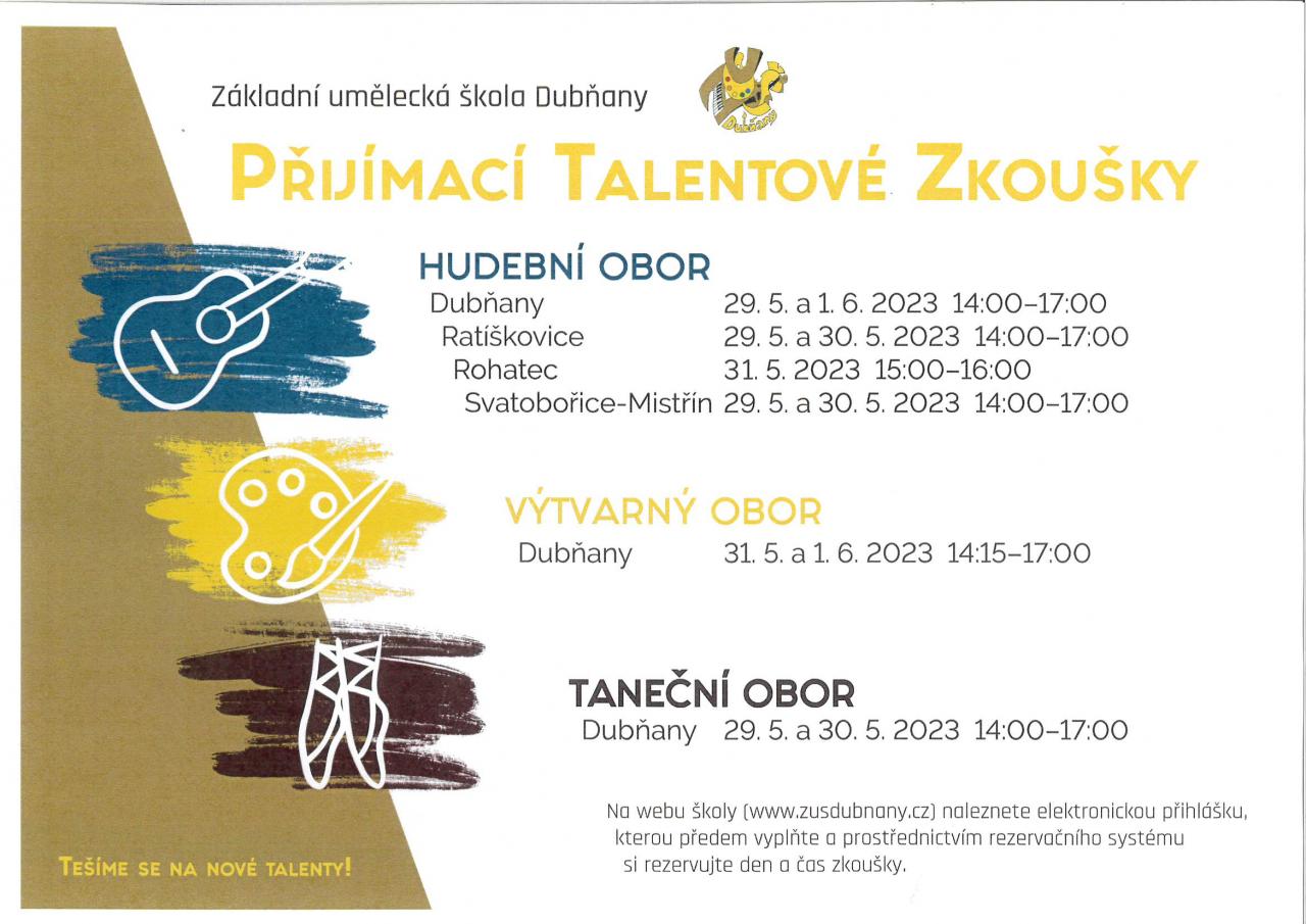 Talentové zkoušky do hudebního, výtvarného a tanečního oboru.