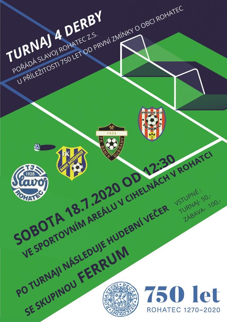 TJ Slavoj Rohatec z.s. pořádá dne 18. 7. 2020 od 12:30 hod. ve sportovním areálu v Cihelnách v Rohatci, u příležitosti 750 let od první zmínky o obci Rohatec, TURNAJ 4 DERBY (TJ Slavoj Rohatec, FK Baník Ratíškovice, FK Baník Dubňany a SK Vacenovice). Po turnaji bude následovat hudební večer se skupinou FERRUM.