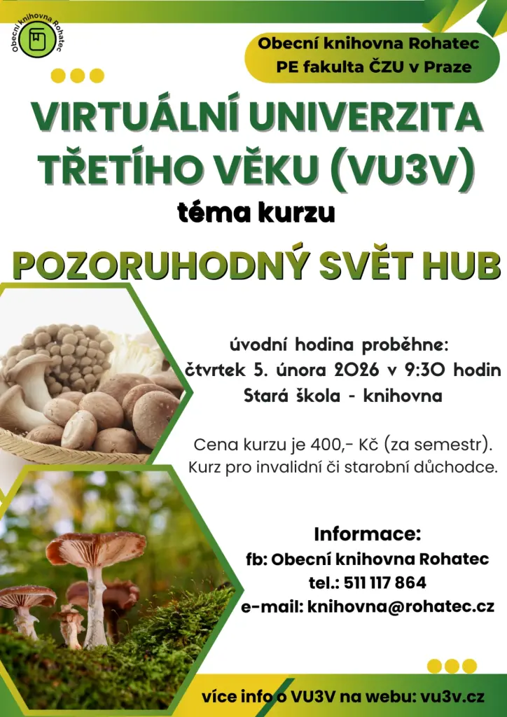 Zveme vás na kurz "Pozoruhodný svět hub", který bude probíhat od 5. 2. Tento kurz je určen pro invalidní a starobní důchodce, kteří mají zájem o fascinující svět hub a jejich význam. Úvodní hodina proběhne v 9:30 hodin na Staré škole - knihovně. Cena kurzu činí 400 Kč.