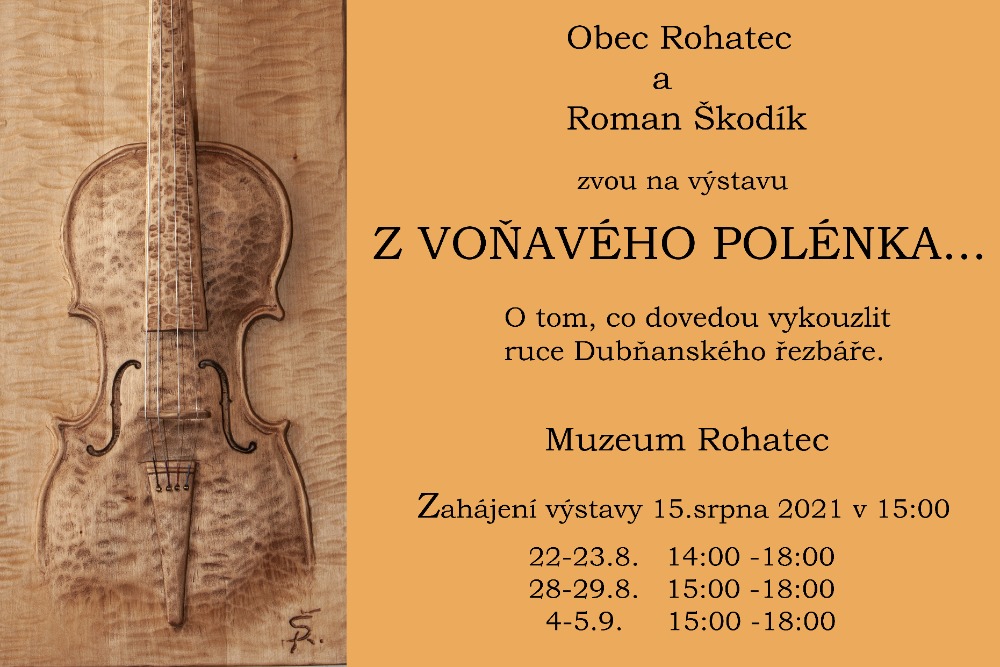 Obec Rohatec a Roman Škodík zvou do Muzea v Rohatci na výstavu Z VOŇAVÉHO POLÉNKA... Zahájení výstavy 15. 8. 2021 v 15:00 hod. Další termíny výstavy naleznete v příloze.