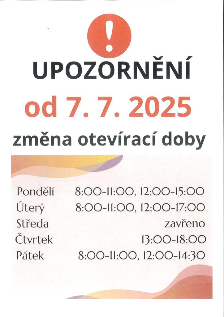 Důležitá informace pro všechny čtenáře! Místní knihovna mění svou otevírací dobu, která začne platit od 7. července. Prosíme všechny návštěvníky, aby se s novými hodinami seznámili v příloze zprávy a přizpůsobili své návštěvy. Děkujeme za pochopení a těšíme se na vaši návštěvu!